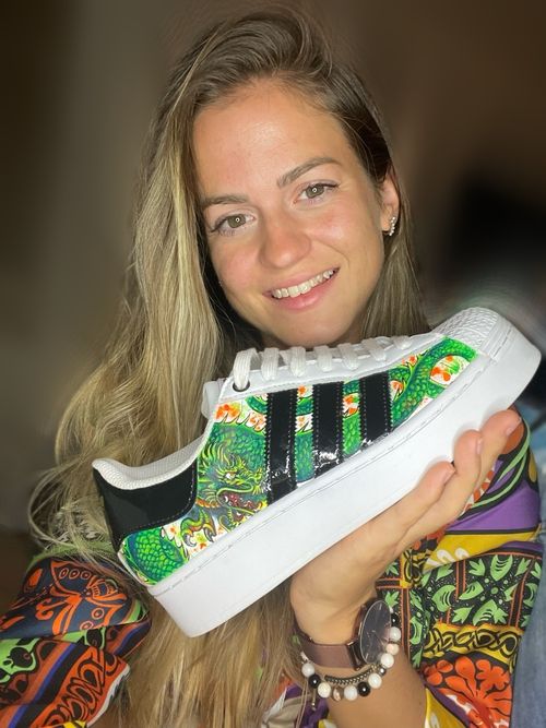 I started with painting on textile slip-ons, since then my art evolved to almost all kinds of surfaces, from leather to wood and plastic till canvas paingtings